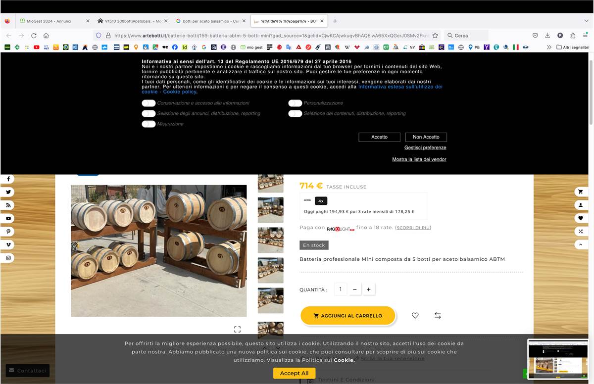 Circa 300 botticelle (tutte piene di aceto balsamico nei vari stadi di maturazione) e contta la attrezzatura necessaria alle varie lavcorazioni